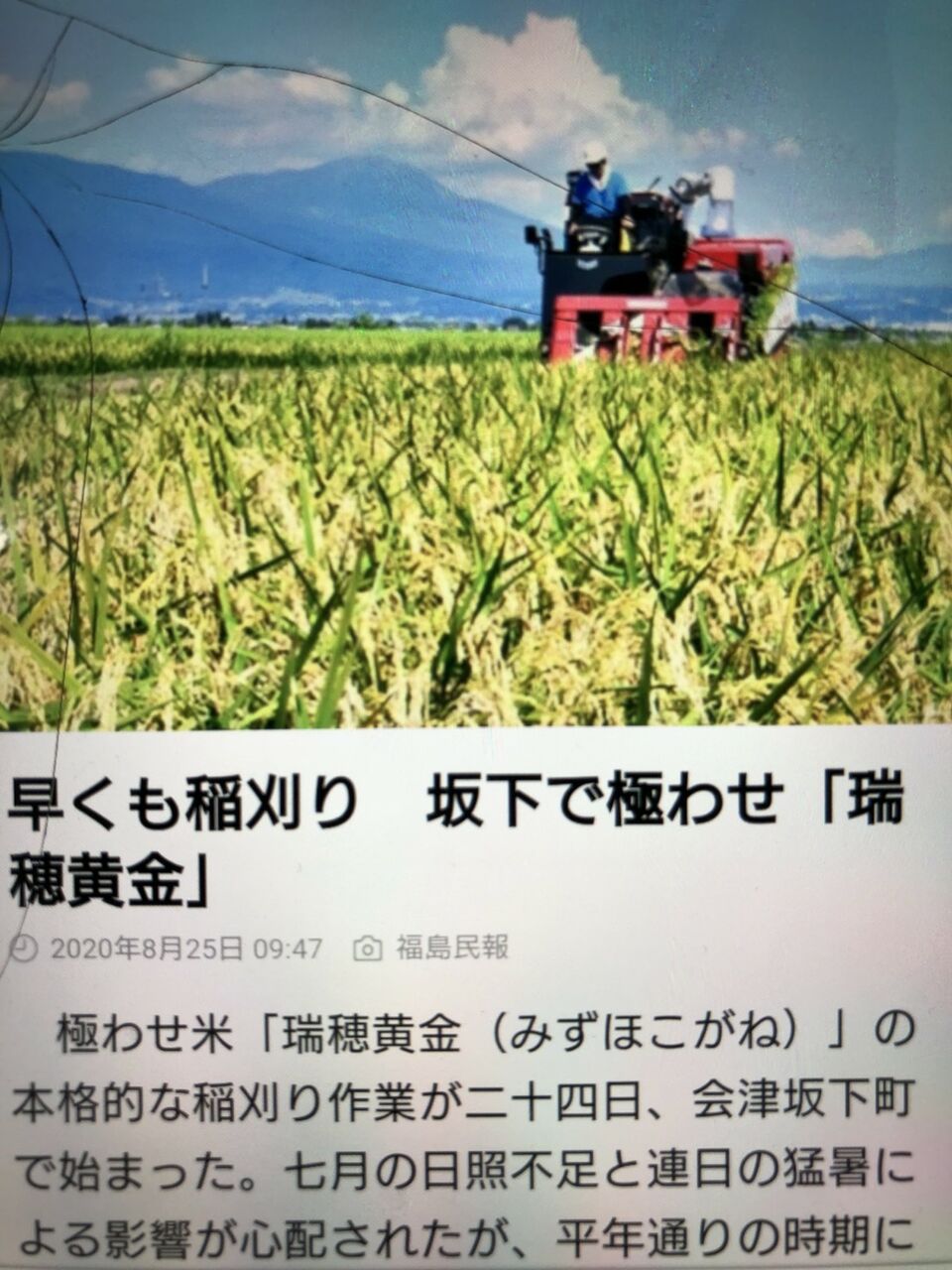 また昨日は福島民報社からのラインニュースが入り早くも今年の稲刈りが始まりました👍